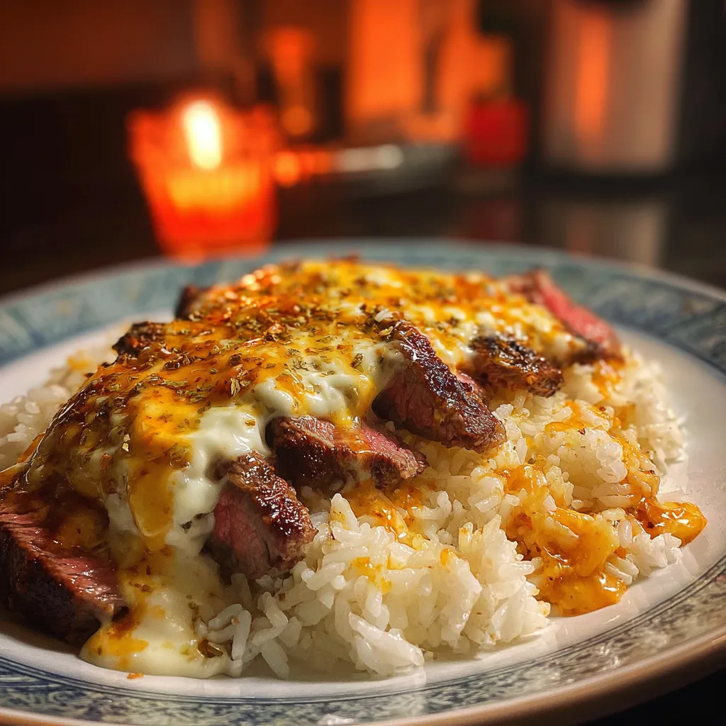 A hearty and comforting dish made with tender steak pieces cooked with seasoned rice and finished with melted cheese for a rich, satisfying meal.