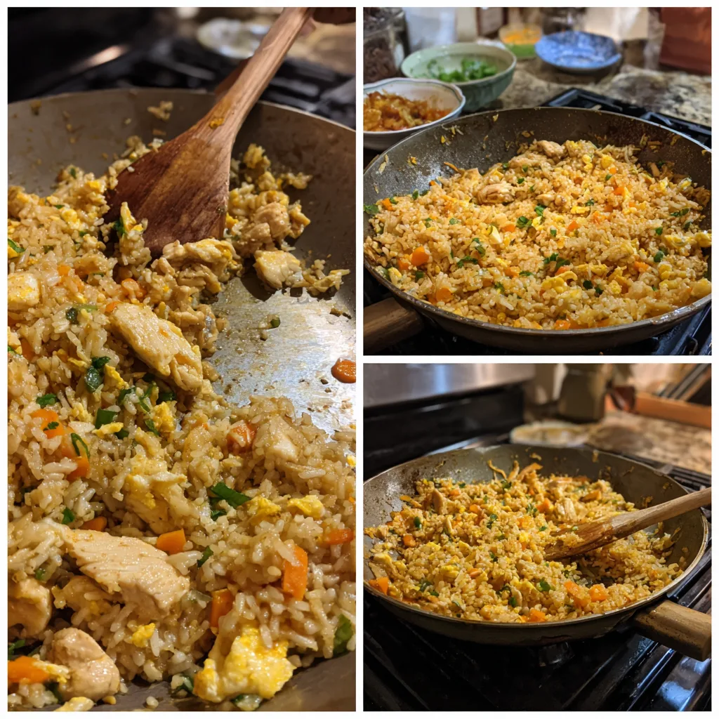 - Add cooked rice, breaking up clumps, and stir-fry for 3–4 minutes until lightly crispy.