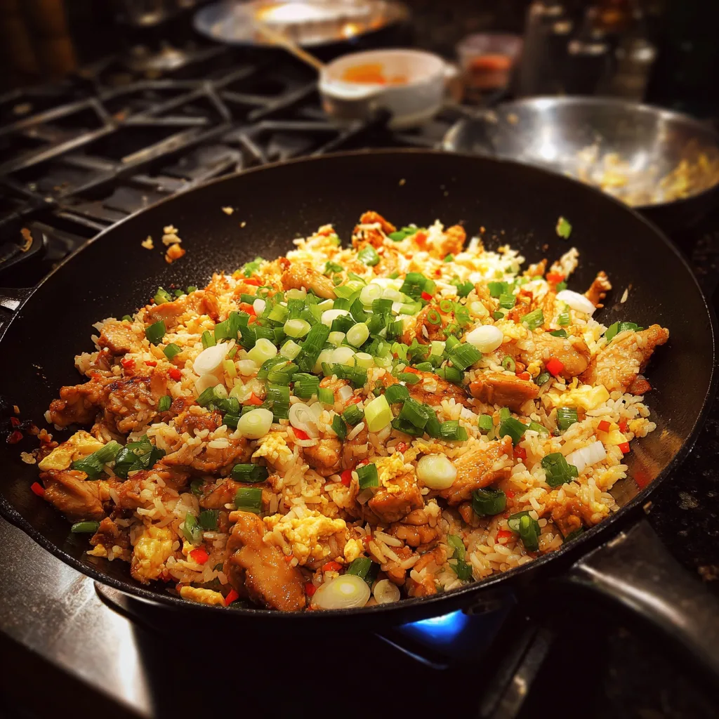 A bold and flavorful fried rice dish featuring tender chicken, fluffy rice, vegetables, and a creamy, spicy-sweet Bang Bang sauce that brings everything together in one irresistible meal.