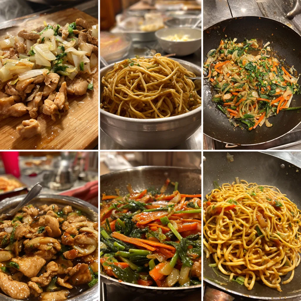 Carrots, bell peppers, and cabbage bring color, crunch, and freshness, balancing the richness of the noodles. Green onions add a mild sharpness that brightens the dish. Vegetable oil helps everything cook evenly, while cornstarch can be used to lightly coat the chicken for a silky texture. Salt and black pepper round out the seasoning.