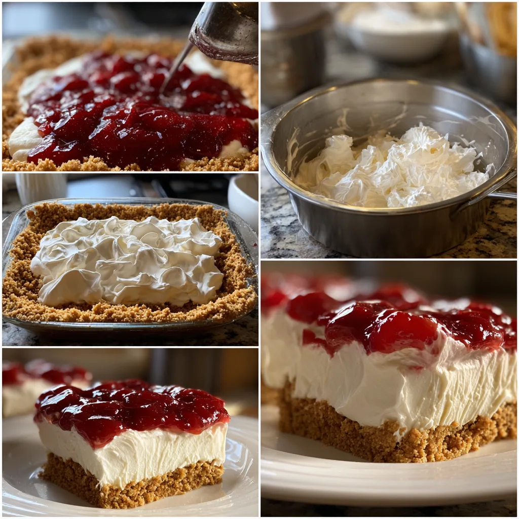 A classic no-bake cherry delight dessert featuring a buttery graham cracker crust, creamy cheesecake layer, and sweet cherry pie topping.