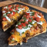 A homemade version of Taco Bell’s iconic Mexican pizza, featuring crispy tortillas layered with seasoned beef, refried beans, melted cheese, and tangy salsa, all baked to perfection.