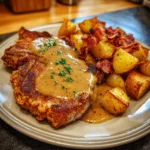 Country Fried Pork Chops with Bacon Gravy is the kind of meal that defines comfort food at its best. Crispy, golden pork chops paired with rich, smoky bacon gravy create a dish that feels hearty, nostalgic, and deeply satisfying. This is a recipe I turn to when I want something filling and familiar, especially for family dinners or relaxed weekend meals. The pork chops are coated and fried until perfectly crisp on the outside while remaining juicy inside. What truly sets this dish apart is the bacon gravy, which adds depth, saltiness, and a silky texture that brings everything together. Each bite delivers crunch, tenderness, and savory richness. Despite its indulgent reputation, this recipe is straightforward and relies on simple pantry staples. Served with mashed potatoes or biscuits, Country Fried Pork Chops with Bacon Gravy is a timeless dish that never goes out of style.