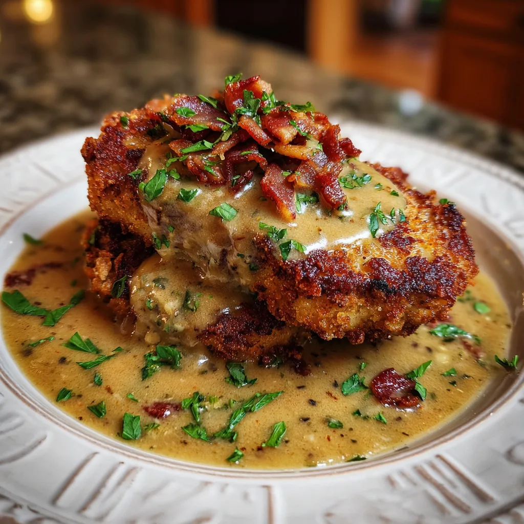 Crispy, golden country-fried pork chops served with a rich and savory bacon gravy, delivering classic Southern comfort with bold, hearty flavor.