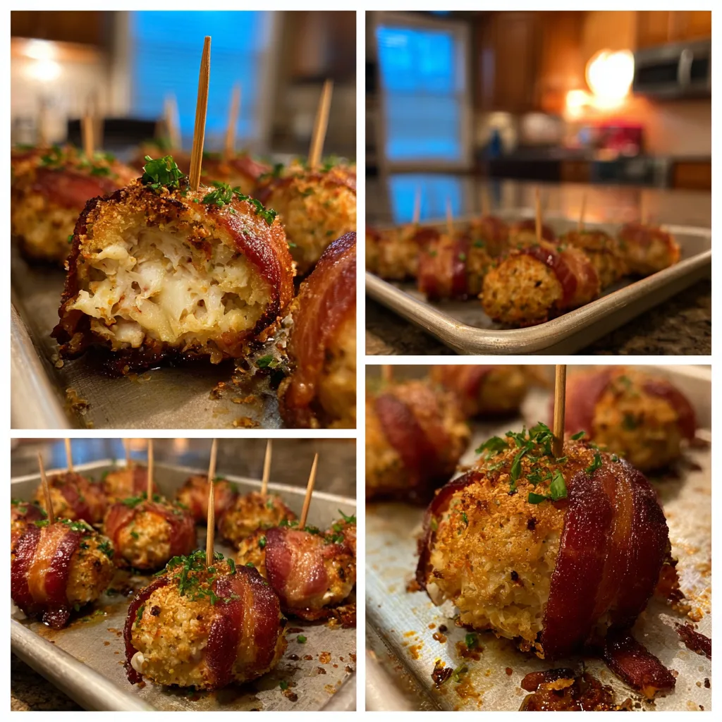 Savory bite-sized appetizers made with creamy crab filling wrapped in crispy bacon and baked until golden and irresistible.