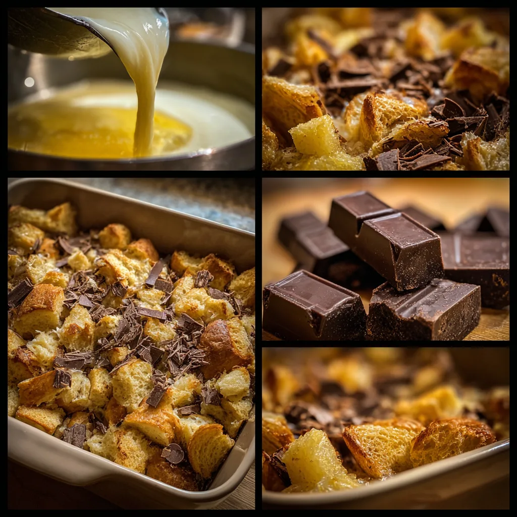 A rich and indulgent dessert made with chunks of bread soaked in a dark chocolate custard, then baked until soft and gooey inside with a slightly crisp top.