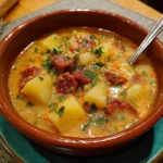 A hearty Spanish potato soup with smoky chorizo, tender potatoes, and a rich, savory broth infused with garlic and paprika.