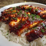 Sweet and smoky honey BBQ chicken served over fluffy rice, featuring tender chicken coated in a rich barbecue glaze for a simple and satisfying meal.