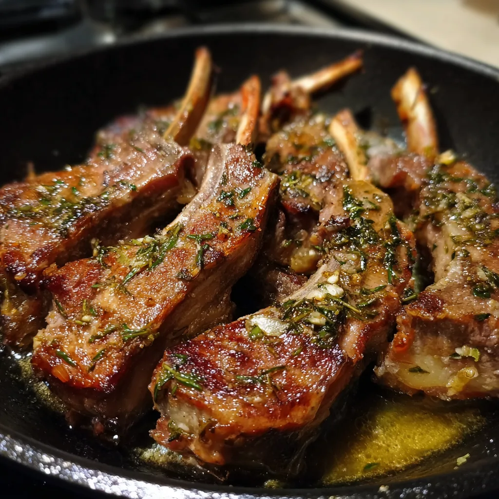 Lower the heat and add butter to the same skillet. Once melted, stir in the garlic, rosemary, and thyme, allowing the herbs to infuse the butter without burning the garlic. Return the lamb chops to the pan and spoon the garlic butter over them repeatedly.
