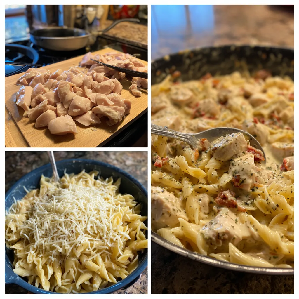 - Add sun-dried tomatoes, heavy cream, and chicken broth. Simmer for 3–4 minutes.