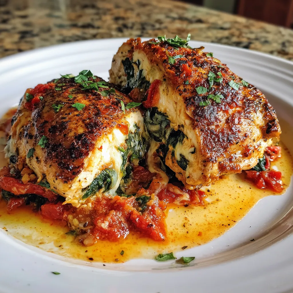 Juicy oven-roasted chicken breasts stuffed with sweet roasted red peppers, fresh spinach, and melted mozzarella cheese for a flavorful and elegant main dish.