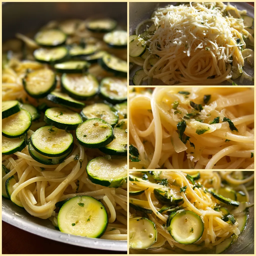In the same skillet used for the zucchini, lightly sauté the garlic in a small amount of olive oil until fragrant. Return the zucchini to the pan and add a splash of the reserved pasta water. Drain the spaghetti and add it directly to the skillet.