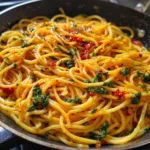 Spaghetti alla Nerano is one of those deceptively simple dishes that surprises you with its depth of flavor. Originating from the small village of Nerano on Italy’s Amalfi Coast, this pasta transforms humble zucchini into a luxuriously creamy sauce without the addition of heavy cream. The magic lies in the slow frying of zucchini slices and the careful emulsification of cheese and pasta water, creating a silky texture that coats every strand of spaghetti.