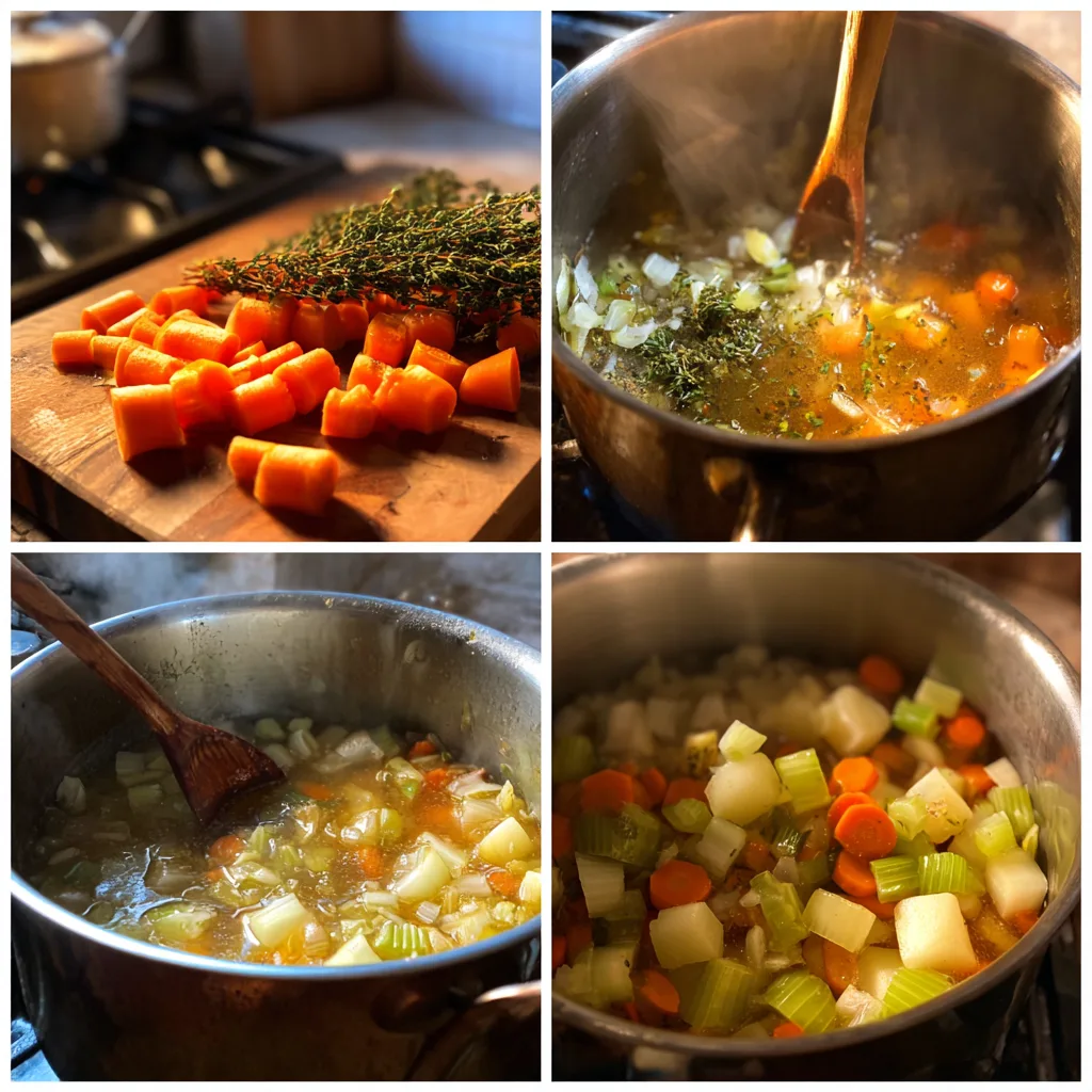 Heat olive oil in a large pot over medium heat. Add diced onion, carrots, and celery. Sauté for about 5–7 minutes until softened and fragrant.